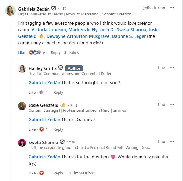 I started consuming more stuff from their team. Then, I joined them on LinkedIn. One day, a virtual friend of mine, Gabriela Zedan (who’s also the Digital Marketer at Feedly), suggested I join the 30-Day Creator Camp organized by Buffer.