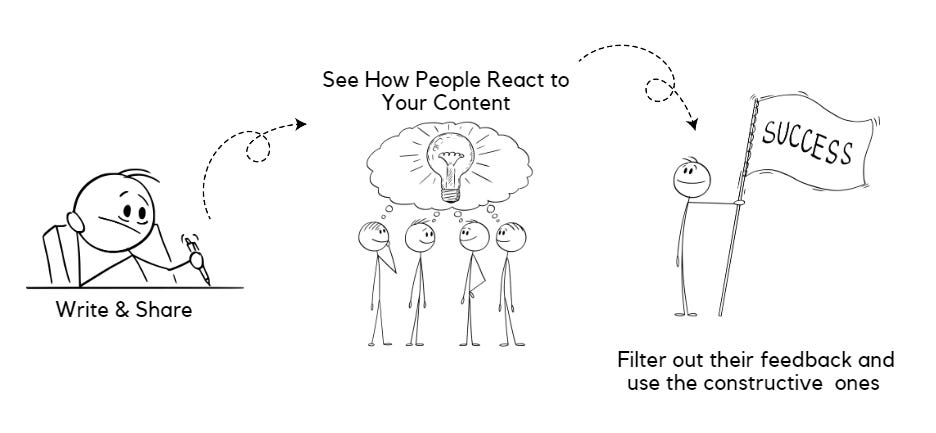 Write and share something each day without worrying too much about perfection. Aim to gather as much feedback as possible (the real one).